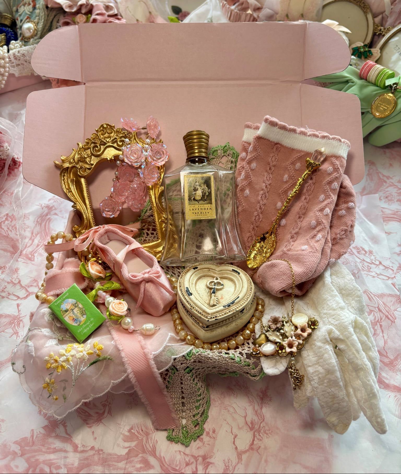 A magical treasure box of pink vintage wonders. The Vintage Christmas Gift Box is an Enchanting bespoke bundle filled with 8–10 handpicked vintage and vintage-inspired treasures, each chosen with love to add a touch of whimsical charm.